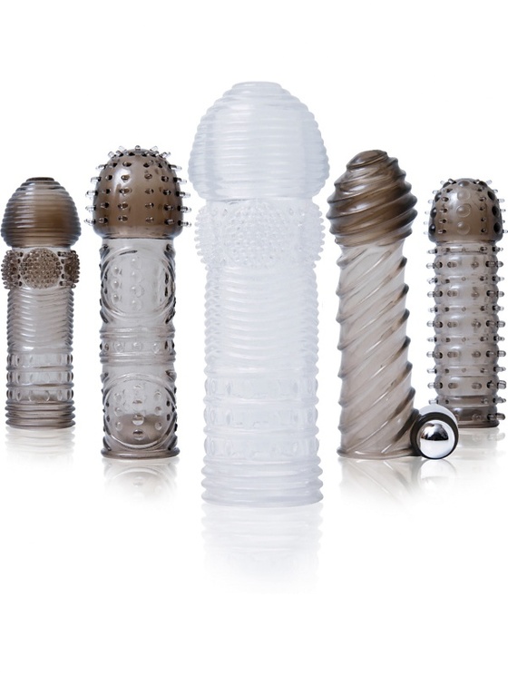 Vibrating Penis Sleeve Kit contains five different penis sleeves, one completely transparent and four darker semi-transparent. These penis extensions are made of elastic and soft material, which makes them suitable for most people.