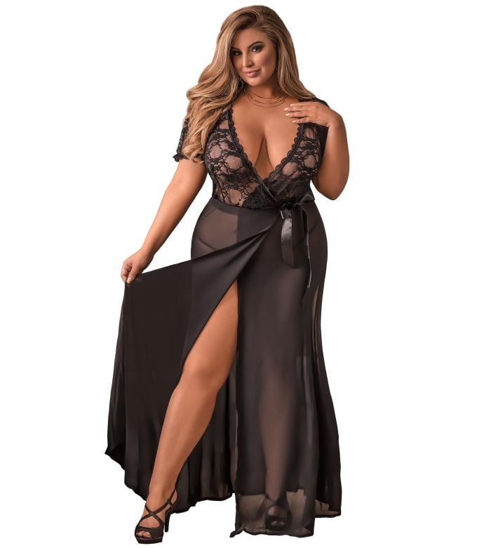 - Description: From the Exposed by Magic Silk collection, this style includes: A full length robe featuring a v-neckline, scalloped lace trim, short cape style sleeves, and side satin ribbon closure; and a matching classic g-string. This style is a #1 seller for Lingerie Mart.