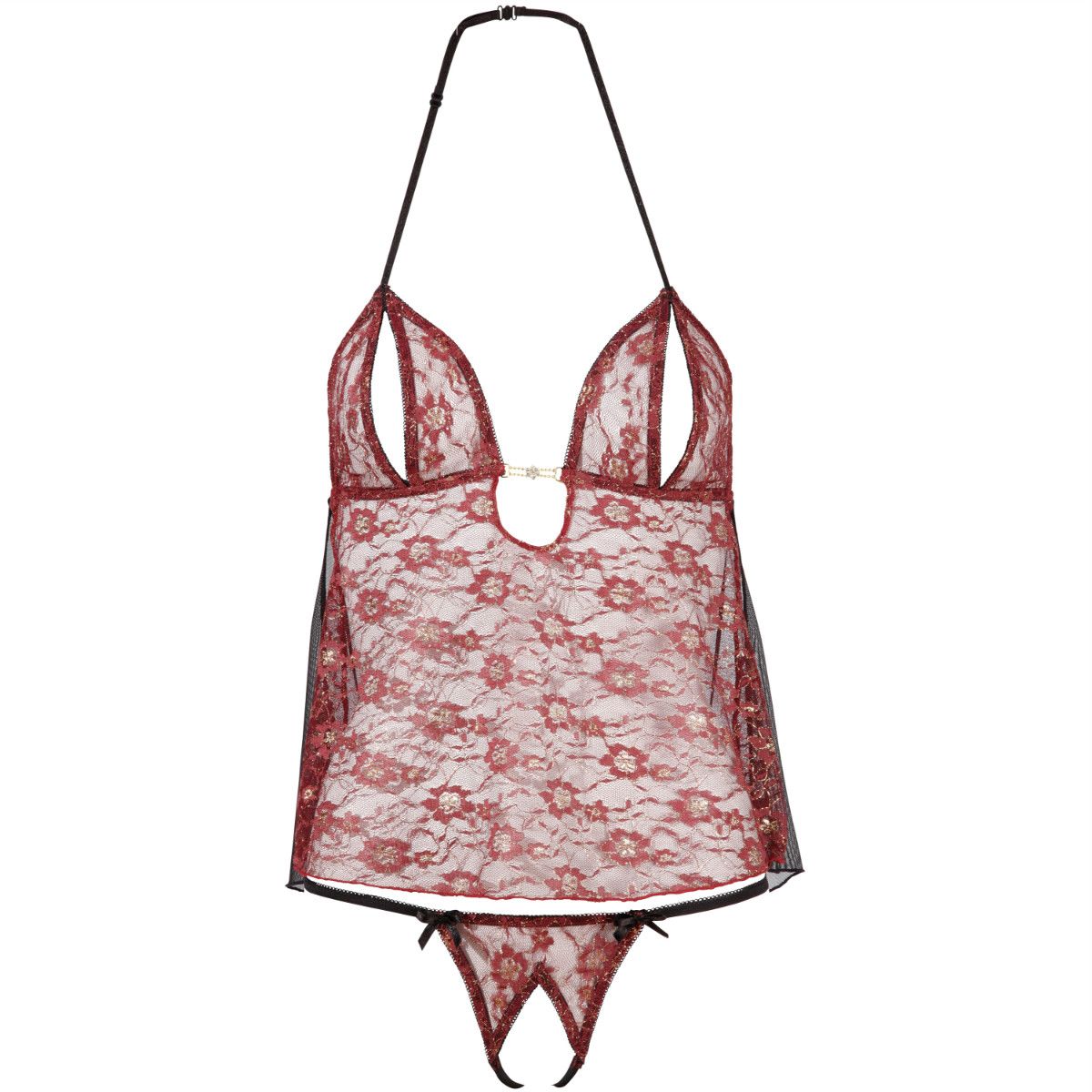 Flared Babydoll, open at the sides, with adjustable halterneck and glossy rhinestone adornment. String ouvert included. Both items made of delicate red lace with golden shine. 92% polyamide, 8% metal.