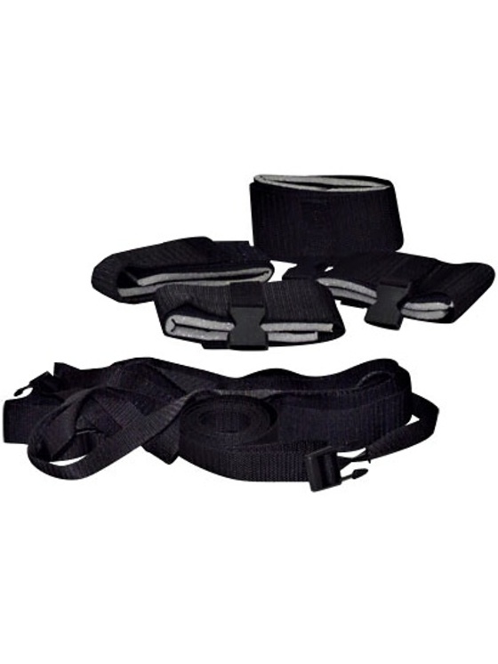 This practical system consists of two long nylon-ropes (320 cm) that are attached to a central strap (180 cm) that is placed under the mattress. You get 4 attachment points – 2 for hands and 2 for feet – that are easily adjusted and secured with click buckles.