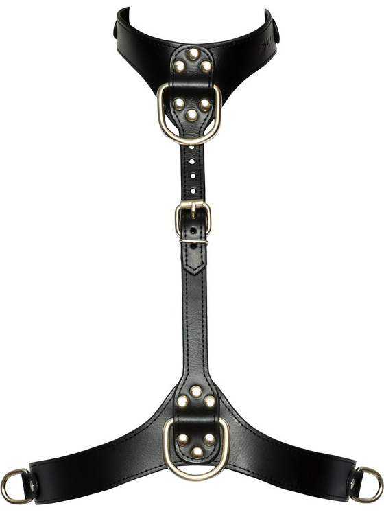 This is a stylish chest harness from Bad Kitty in a stylish leather look (polyurethane) and silver-colored details. It is well made and is adjustable thanks to its multiple buckles for a perfect fit (S-L).
