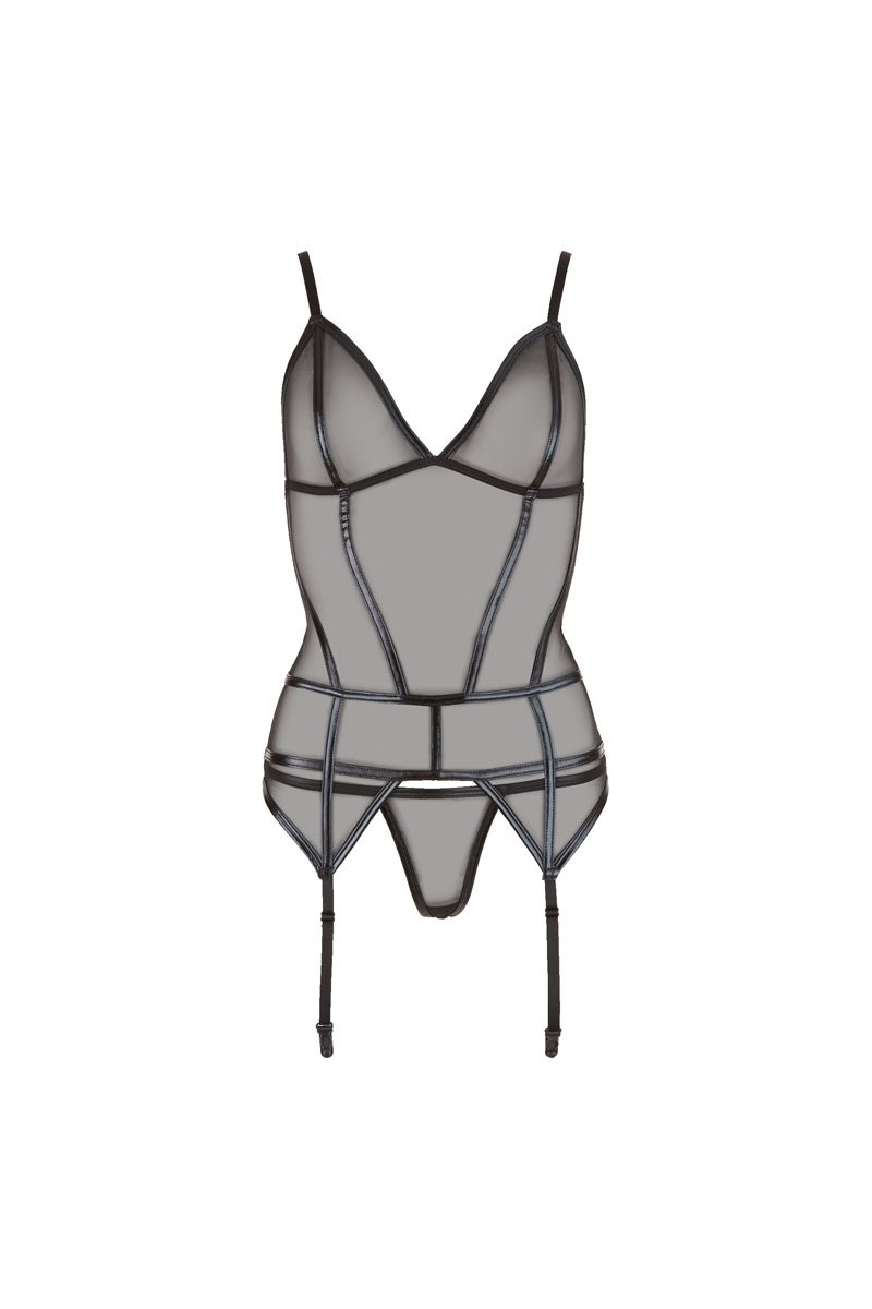 Feel sexy and confident in this provocative garter top with wetlook details. The top is made of translucent material and has wetlook garter straps that are adjustable. There is a hook-fastener at the back and the bra straps are also adjustable, which makes sure the top has a perfect fit and is comfortable to wear. This beautiful garter set includes a matching G-string that completes your seductive look.