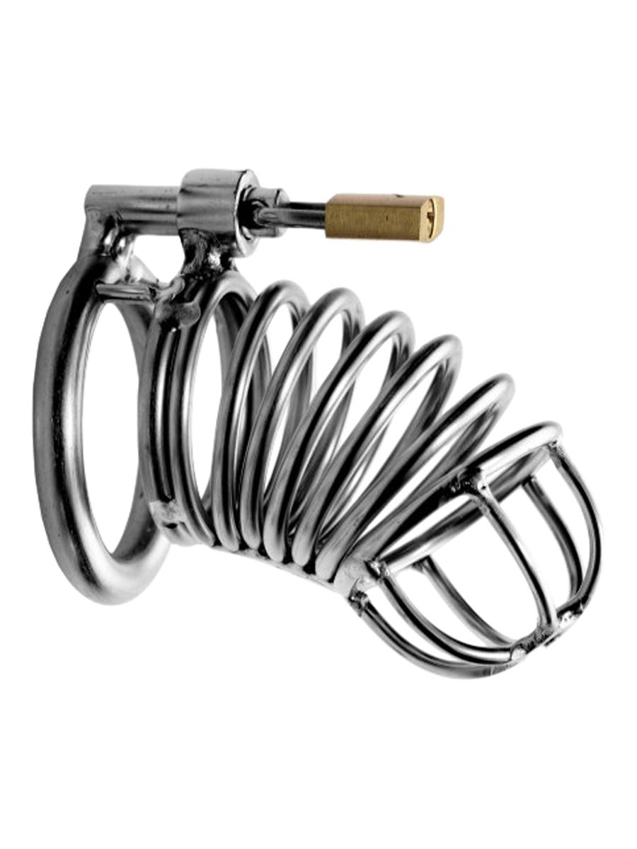 Has your naughty slave been enjoying too much liberty? Keep your captive under lock and key with this intriguing confinement piece! Lock him into submission by choosing one of the three differently sized rings, and placing the cage over the penis shaft. This is where the power exchange happens. With his manhood confined in this fortress of steel, he will be unable to achieve a full erection, limiting his satisfaction and stimulation, while keeping him pleasantly compliant. Viva la domination!