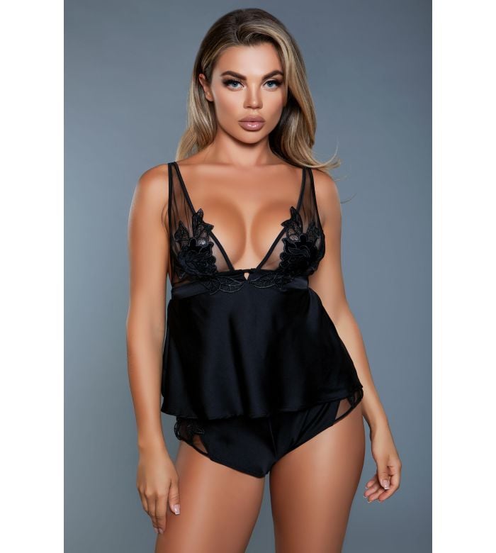 - Description: 2 pc satin cami set with plunging neckline top and elasticated mini shorts, sheer mesh, and floral embroidered lace design.
