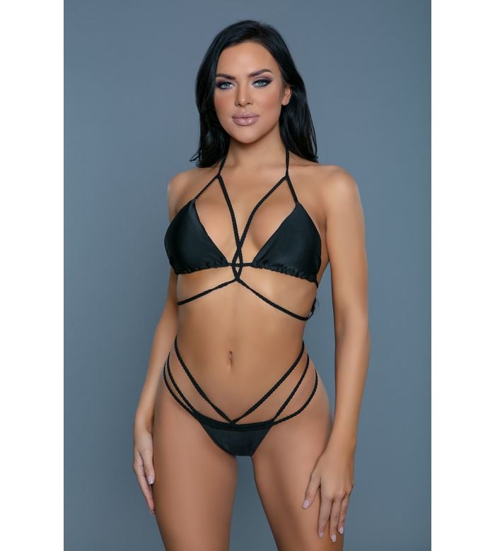 - Description: 2 pc bikini set with halter neck braided straps and strappy design cheeky coverage bottom.
