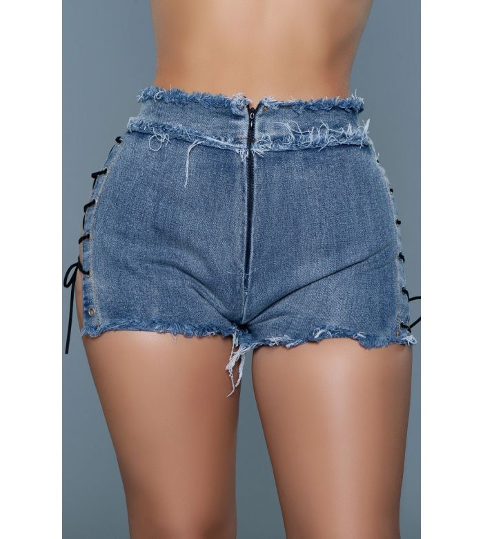 - Description: A real attention getter, yet so sexy and daring! Mid rise denim shorts with tie up side design and button zipper closure.