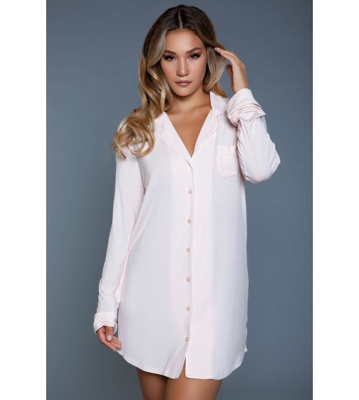 • Description: Beautiful, soft, and comfortable 1-piece notched collar long-sleeves sleepshirt with front button closure.