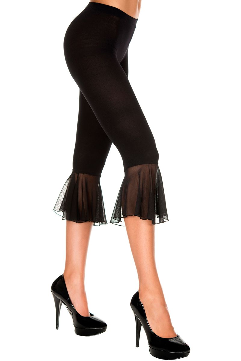 Go for a unique look in these striking leggings! The black leggings are made of thin, transparent fabric, so your buttocks and upper legs are seducitvely visible. The bottom is decorated with ruffles for a striking and special look. The leggings are very comfortable to wear and have a perfect fit thanks to the elastic and soft fabric. Wear the leggings in combination with a sexy costume, a beautiful dress or your favourite lingerie and feel irresistible!