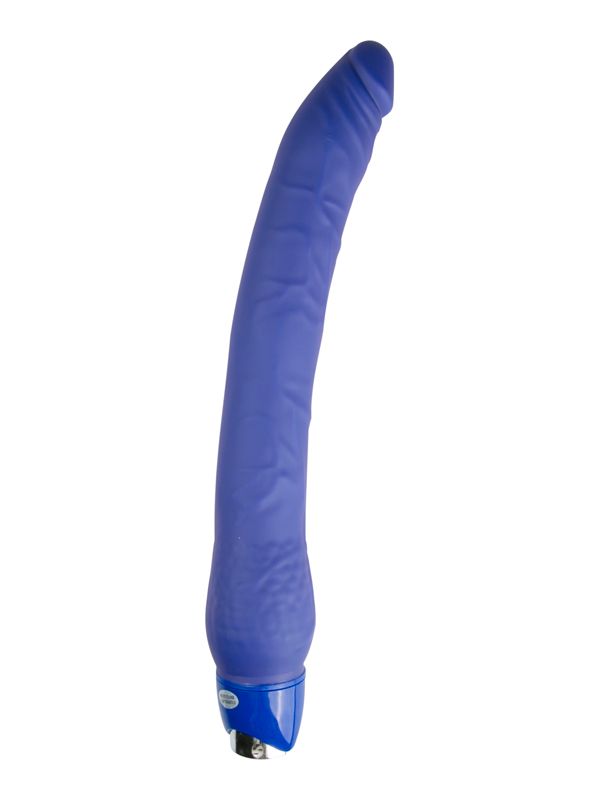 Blue vibrator with pronounced glans, bulging vains and a continuously adjustable vibration.