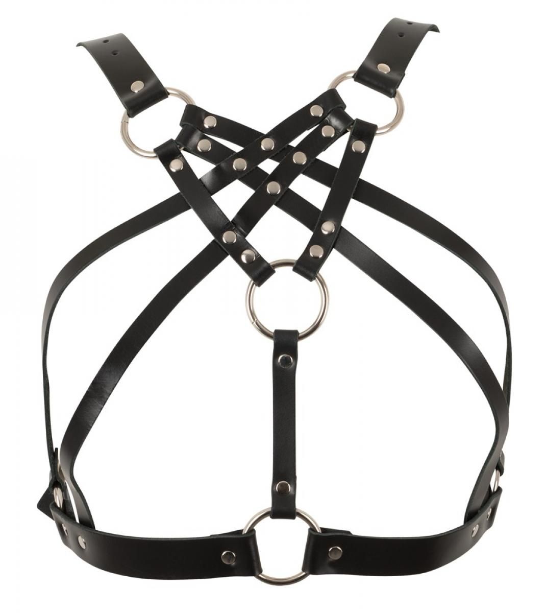 This chest harness stands out with its D-rings and decorative studs. The straps can be adjusted.