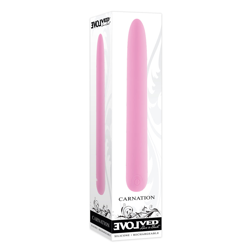 Evolved Carnation from Evolved Novelties. Carnation Vibrator is a classic shape with powerful vibrations! This traditional, straight vibe is tall and thin at 7 inches high and just over 1 inch in girth, delivering delicious possibilities for satisfaction with 10 powerful speeds and functions guaranteed to wow your erogenous zones. With a gently tapered tip, body safe creamy smooth material and an easy to use 1 button control panel, it is the ultimate nightstand go to. Enjoy during shower or bath time too, as it is completely water submersible! Magnetic rechargeable, easy to clean and latex free. Features: Silicone rechargeable traditional vibrator. Straight shape with gently tapered tip. Internal and external pleasure. 10 vibrating speeds and functions. Made from creamy smooth Silicone. Easy to use 1 button control, Light Emitting Diode LED lights up button when in use. Size height 7.4 inches, depth 1.07 inches, width 1.07 inches. Insertion length 6 inches, insertion diameter 1.7 inches. Bulk weight under half a pound. Phthalate free and latex free. Waterproof, submersible vibrator. Magnetic rechargeable, USB cable included. Categories: Vibrators, Classic Vibrators, Firm Vibrators, Rechargeable Vibrators. 5 years warranty. 2023.