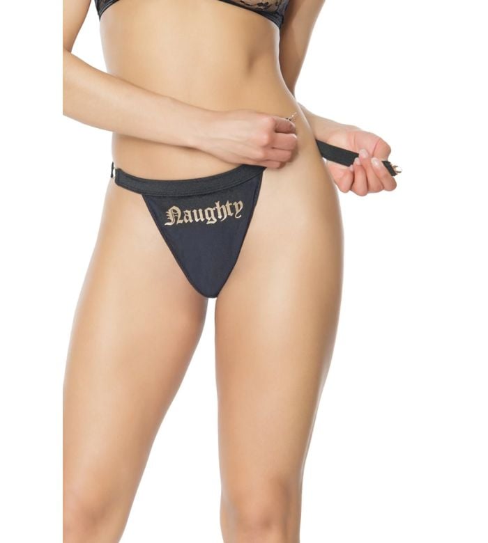 - Description: The Naughty List Panty features a striking foil ‘Naughty’ graphic, a comfortable covered elastic waistband, and gold quick-release metal clasps, all in a stylish black and gold stretch knit design.