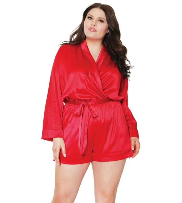 - Description: The Queen Size Red Handed Romper Robe features stylish cuff and collar details, an elasticized waist for a comfortable fit, and a removable stretch satin belt, all in a vibrant red stretch satin fabric that beautifully enhances your silhouette.
