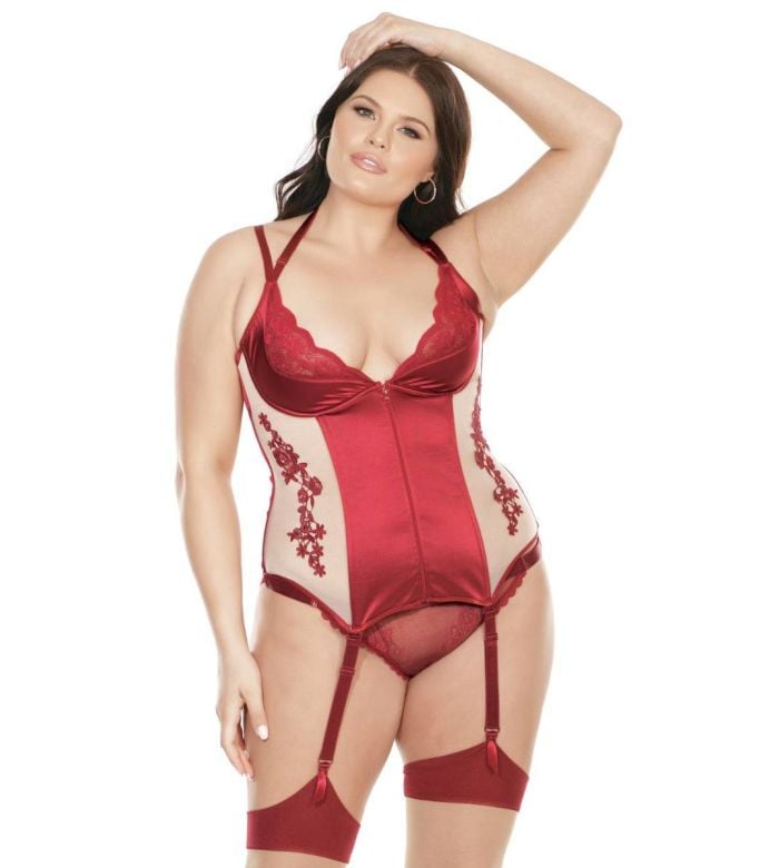 - Description: Feel like royalty in this stunning stretch nylon and satin bustier. Features floral applique accents, lightly padded demi cup with double strap detail in a halter neck design. Zipper front closure and lace up back.