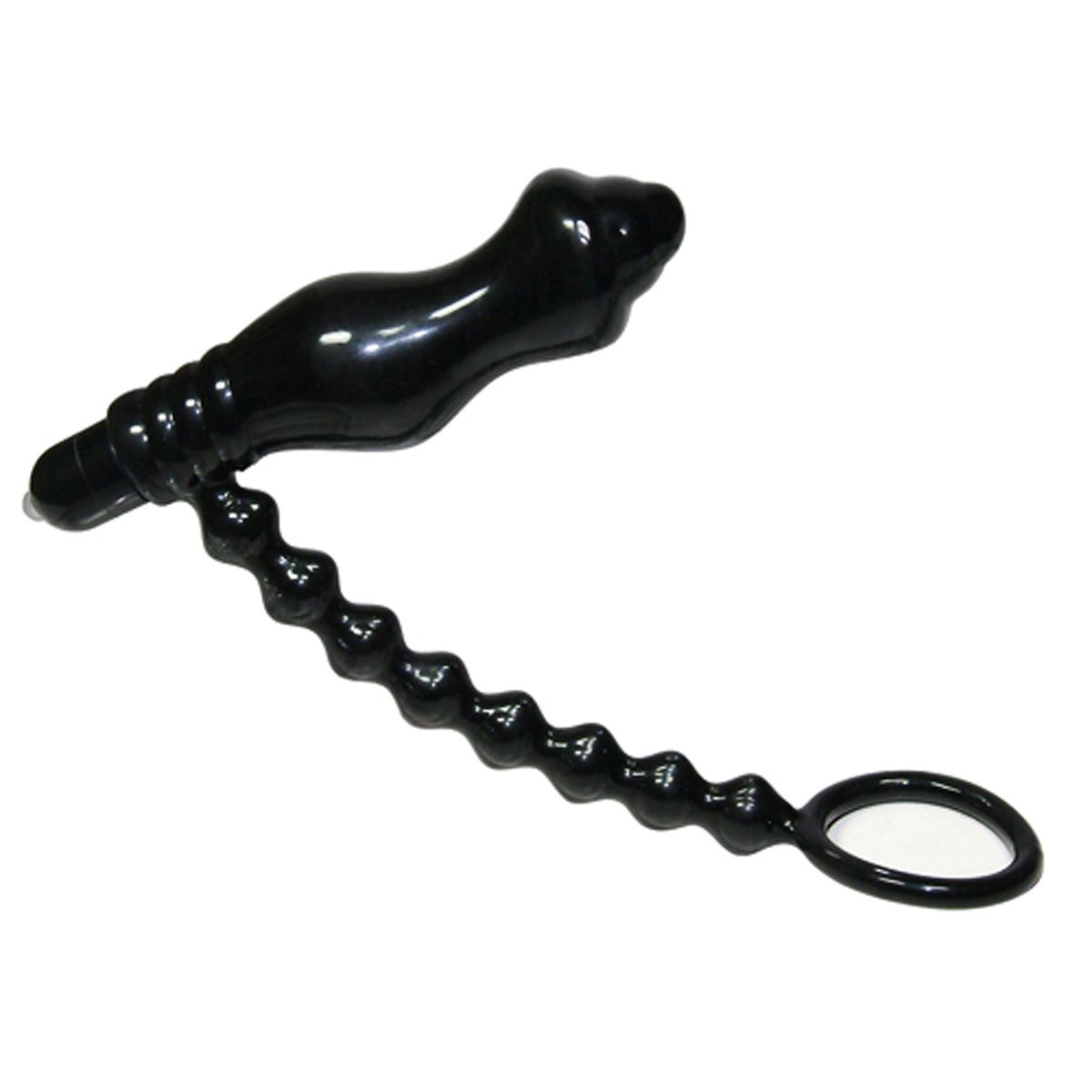 Cock ring, prostate vibrator and beaded strip. Ring diameter: approx. 3,5 cm (slightly flexible), 13 cm beaded strip, anatomically shaped prostate vibrator featuring a 3-step rhythm regulator button. Total size: 13,5 cm, approx. penetration depth: 9 cm. 2,2 – 3,4 cm diameter. Black. Material: PVC, free of phthalates according EU regulation REACH.