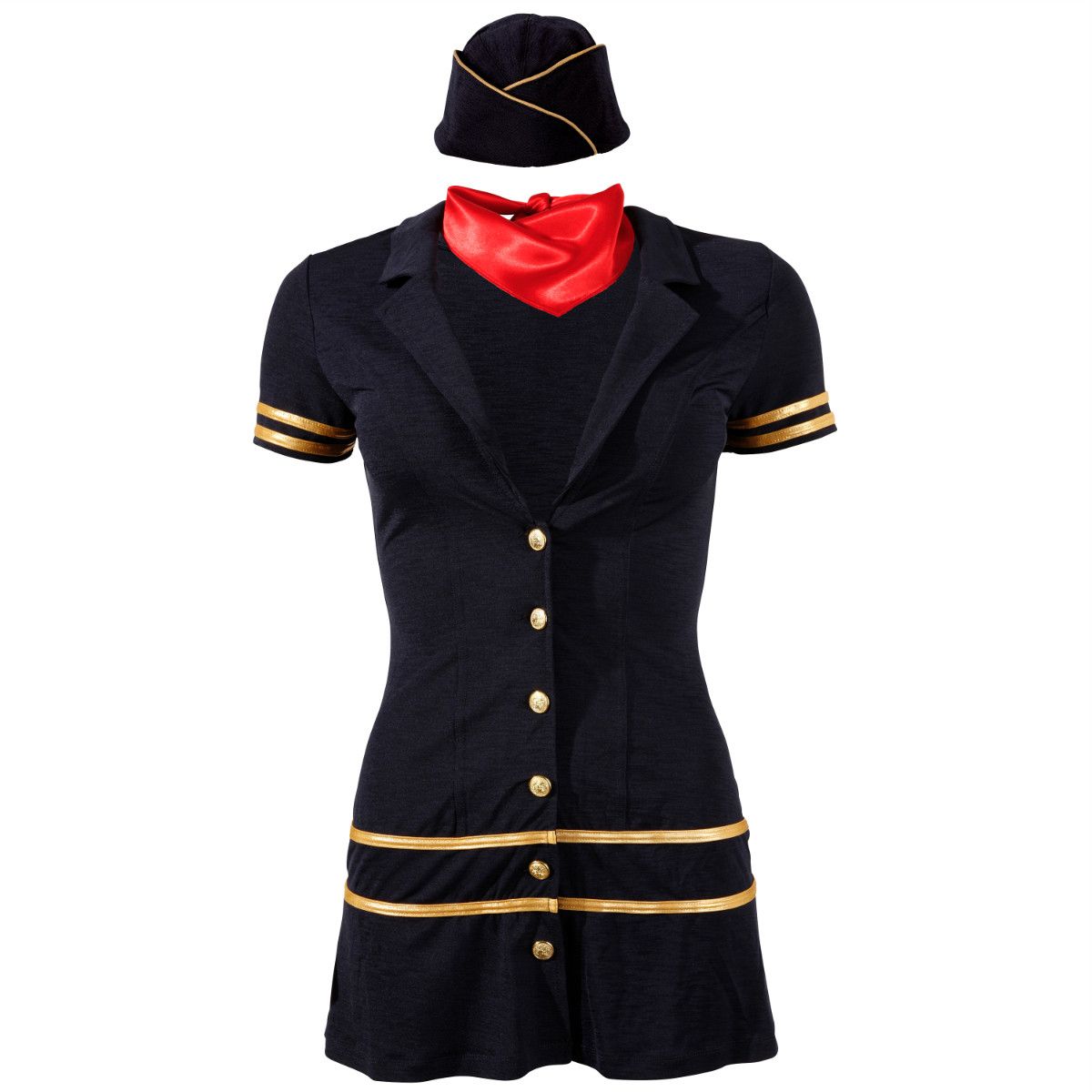 Blue mini dress with short sleeves and a low neckline. Adorned with golden stripes all over and with golden buttons in the front. On the bottom with “Flying Angel” print. Matching cap and a red neckerchief included. DRess and cap: 92% polyester, 8% spandex.