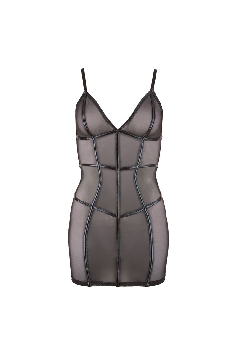 This black mini dress shows off your sexy body in the most seductive way. The dress is made of translucent and elastic material that perfectly fits your body. The dress is decorated with stripes made of wetlook material for a tough and striking twist. Wear the dress over a beautiful lingerie set, in combination with a pair of stockings and high heels, or without anything at all, and feel irresistible.