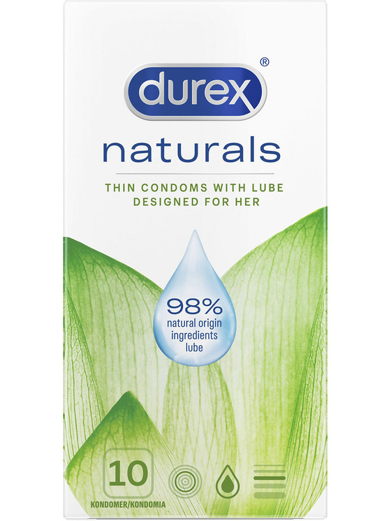 Durex Naturals condoms are designed with a focus on women’s well-being, pleasure and security. The condoms are thin and have a thickness of only 0.055 mm, which gives an extra intimate and close feeling. They are also treated with a water-based lubricant containing 98% natural ingredients for a pleasant sensation during intercourse.
