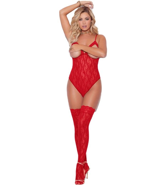 - Item: Elegant Moments Cupless Lace Teddy And Matching Thigh Highs With Lace Top EMH13005