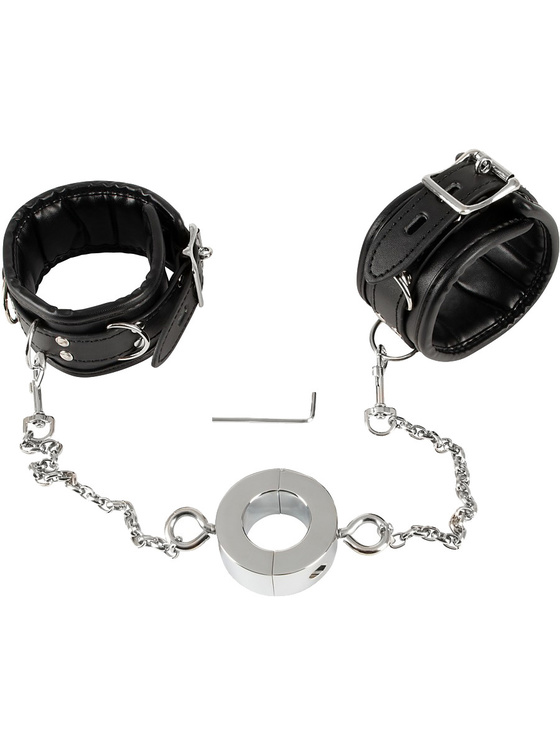The PU-leather handcuffs are softly padded and adjustable for maximum comfort and best fit. With two carabiners, you can attach the chains to the shackles that go to the robust cockring.
