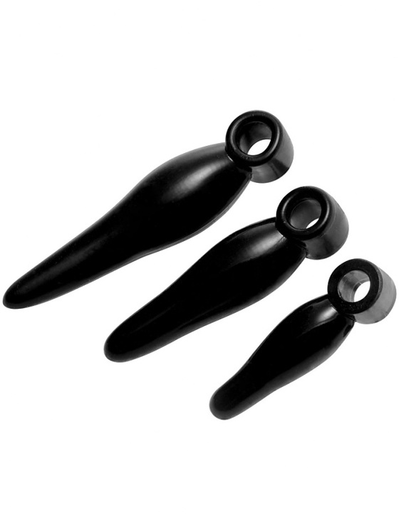 A set of three different sizes of smaller plugs gives you and your partner a perfect base for anal-stimulation. With a ring, you can thread them over your finger and then stimulate your partner, or yourself, with the plug that first begins to narrow and then spreads.