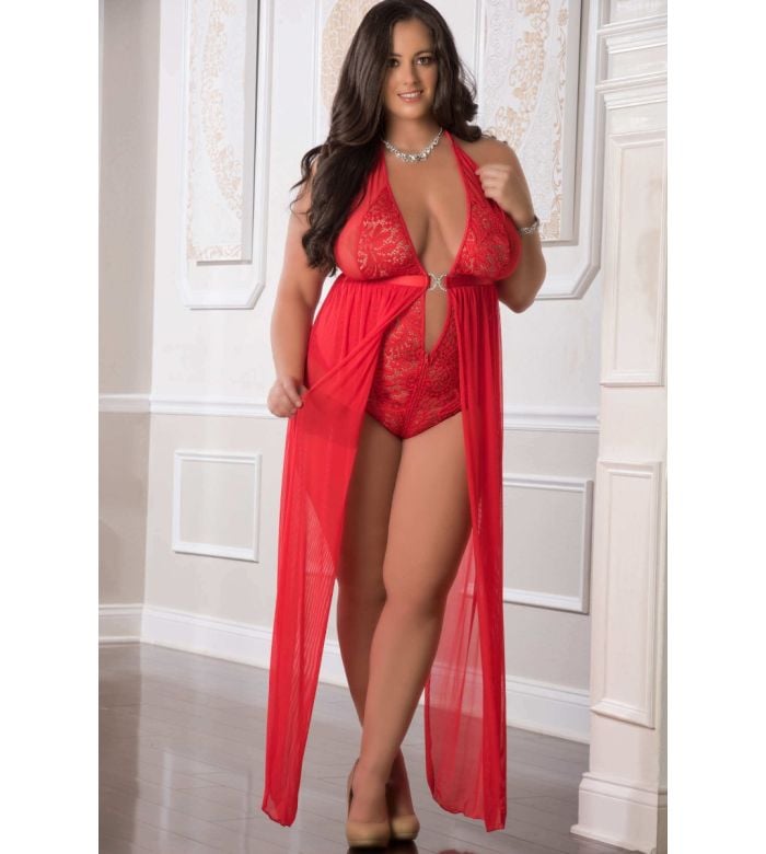 - Description: Flyaway sheer mesh gets sassy over a sexy lacy deep plunging bodysuit with open zipper crotch.