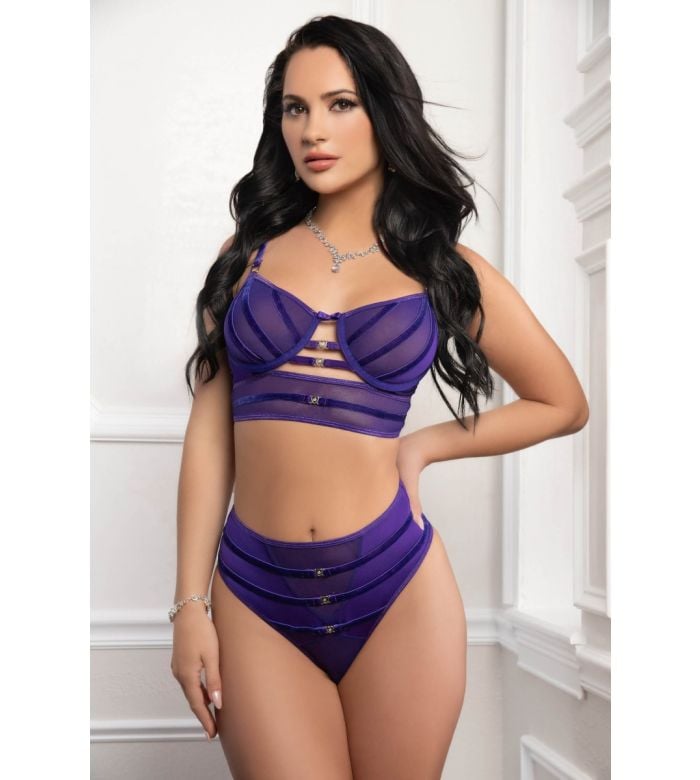 • Description: A classic yet sexy, high waisted panty with cheeky rear view paired up with wire cups bra top that will accentuate your curves with a glamorous mix of lace and mesh, racy velour straps and shimmering heart charm details.