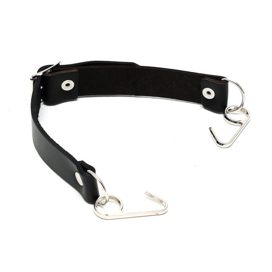 Black leather adjustable strap with metal hooks designed to fit into the corner of the mouth to force a smile.