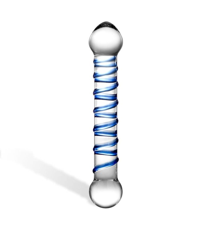 - Description: Take your quest for pleasure to dizzying new heights with the glas Spiral Dildo. This handmade, elegantly constructed adult toy is clear with raised, blue spirals along its shaft to add a unique sensation of excitement. The Spiral Dildo is 6.5 inches in length and made from carefully designed, durable, and body-safe borosilicate glass. It is ergonomically designed for easy, pleasurable insertion with an enlarged head for ultimate satisfaction. The glas Spiral dildo is built for easy upkeep, can pair with every available lubricant, and is cleaned for re-use with soap and water. This lengthy, tasteful dildo retains a range of temperatures for adaptable bedroom play. Run it under a warm tap to heat things up or place it in your freezer for a chillier encounter. Add a new gem to your collection and upgrade your sex life with glas.
