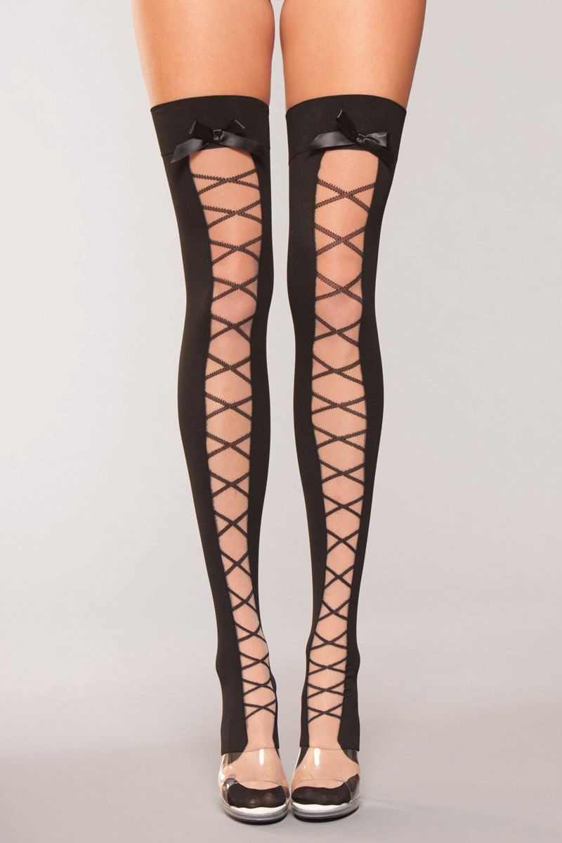 These hold-ups from the Be Wicked collection complete your lingerie set or sexy outfit! the black stockings are provided with a wide, elastic strap at the top. This keeps the stockings from sliding down, so they perfectly stay in place in every situation. The stockings are decorated at the front with a lacing print and a black satin bow at the top. Wear the hold-ups in combination with a seductive lingerie set or a skirt or dress for a complete look.