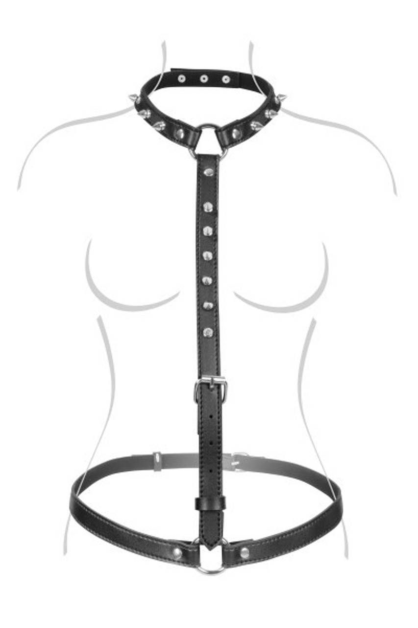 . This fetish harness will go around the waist, pass over the bust and end around the neck. The waist circumference is adjustable from 55 to 81cm, the height is adjustable from 28 to 42cm and the neck circumference is adjustable from 32 to 40cm.