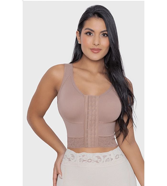 - This high-coverage, multi-use bra gives you the support and sculpting you need for your upper and mid-torso while improving your posture. Made from compressive stretch fabric, it smooths and enhances your shape naturally with full back coverage. The front and shoulder hook-and-eye closures make it easy for you to put on, while the delicate lace trim with a silicone band keeps it securely in place.