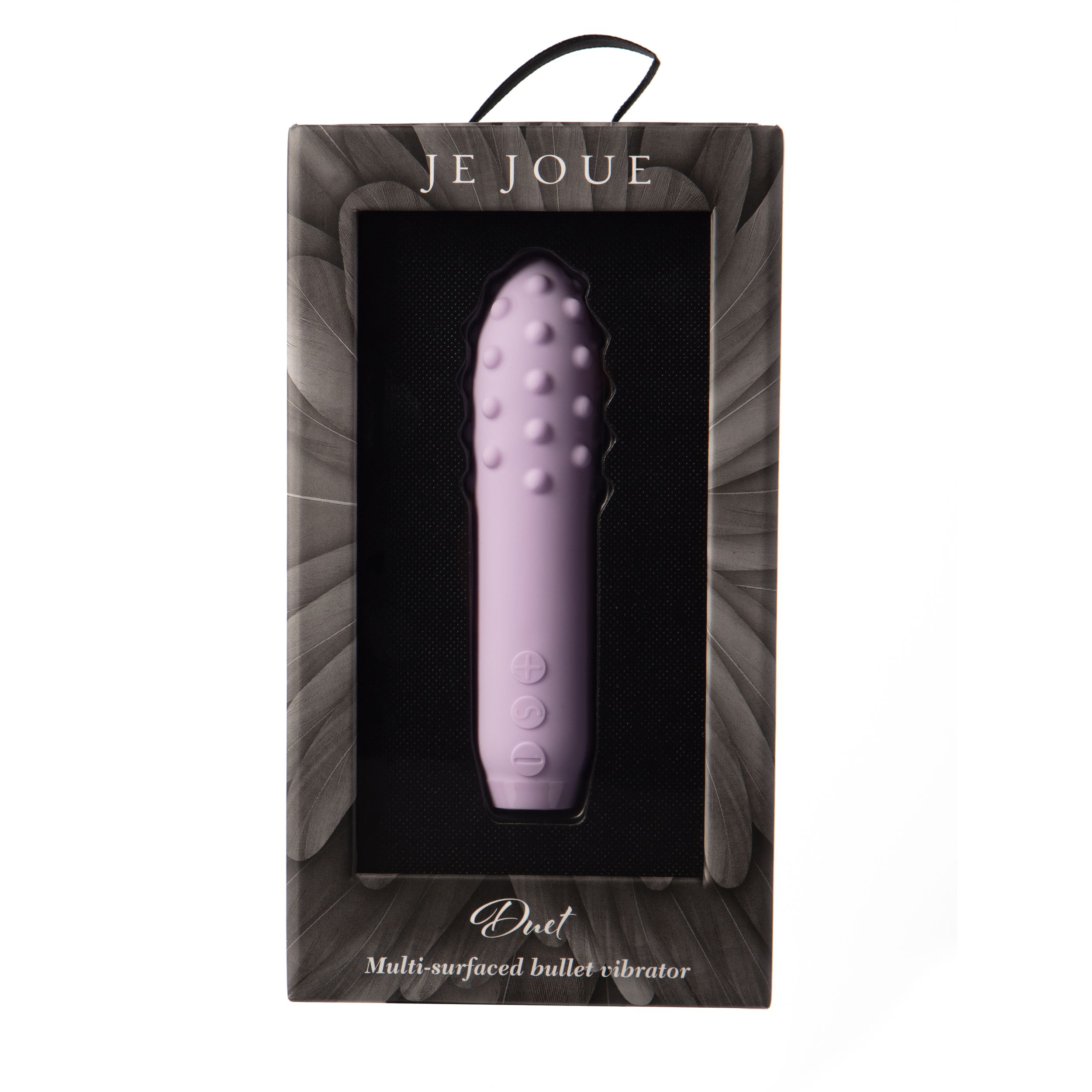 Meet Duet, a multi-surfaced bullet vibrator with small, rounded, graduated pleasure points on one side and a silky smooth surface on the other to give multi-sensations across the body. Use Duet to stimulate external pleasure points such as the clitoris, nipples, and thigh. And if you want to explore further, Duet is the perfect partner for gentle, shallow penetration play with its deeply rich vibrations. With its silky soft, body safe medical grade silicone, Duet feels great to touch and even better to experience. Let Je Joue’s famous rumbly motors pamper your body deeper, giving you a richer, more pleasurable intimate experience.