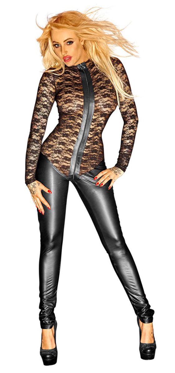 Your evening will be a great success in this kinky catsuit from the Noir Handmade collection! The legs of the catsuit are made of wetlook, while the top part is made of translucent lace with a floral design. The skin-tight catsuit has a zip that starts at the neck, goes over the crotch and stops at the buttocks. Both the lace fabric and the wetlook fabric are elastic for a perfect fit and a great wearing comfort.
