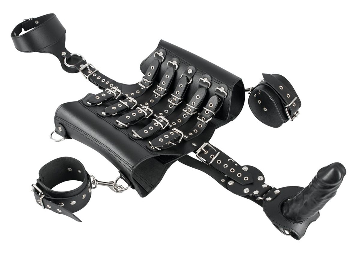 Wide waist cincher with lacing at the back. Jock strap that is attached with a buckle strap, which is one of the straps that leads to the collar. In addition there are handcuffs, which are attached by snap hooks and a latex dildo attached with press studs.