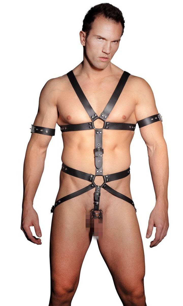 One-piece suit made of stitched, adjustable leather strap with three metal penis/testicle rings (Ø 4 cm, 4.5 cm and 5 cm).