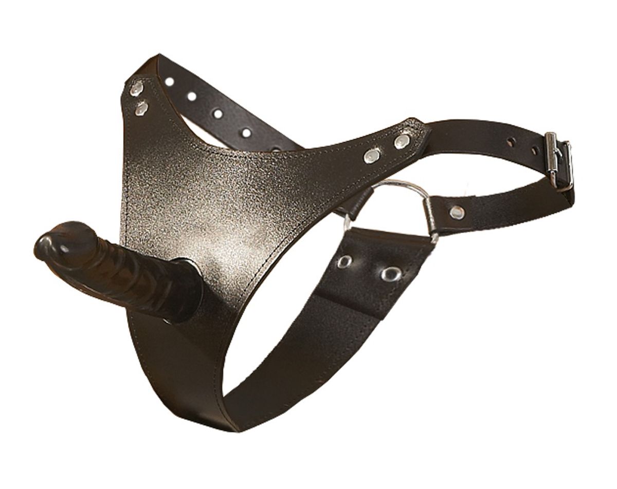 Adjustable leather string with attached, natural looking, firm penis (6″ long, Ø 1.2″).