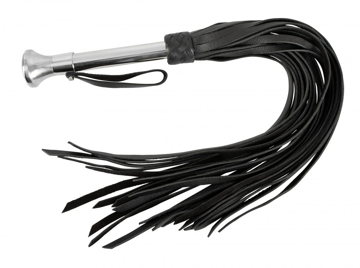 Whip with broad leather straps and handle made of stainless steel with loop. Black/silver. Total length approx. 73 cm.
