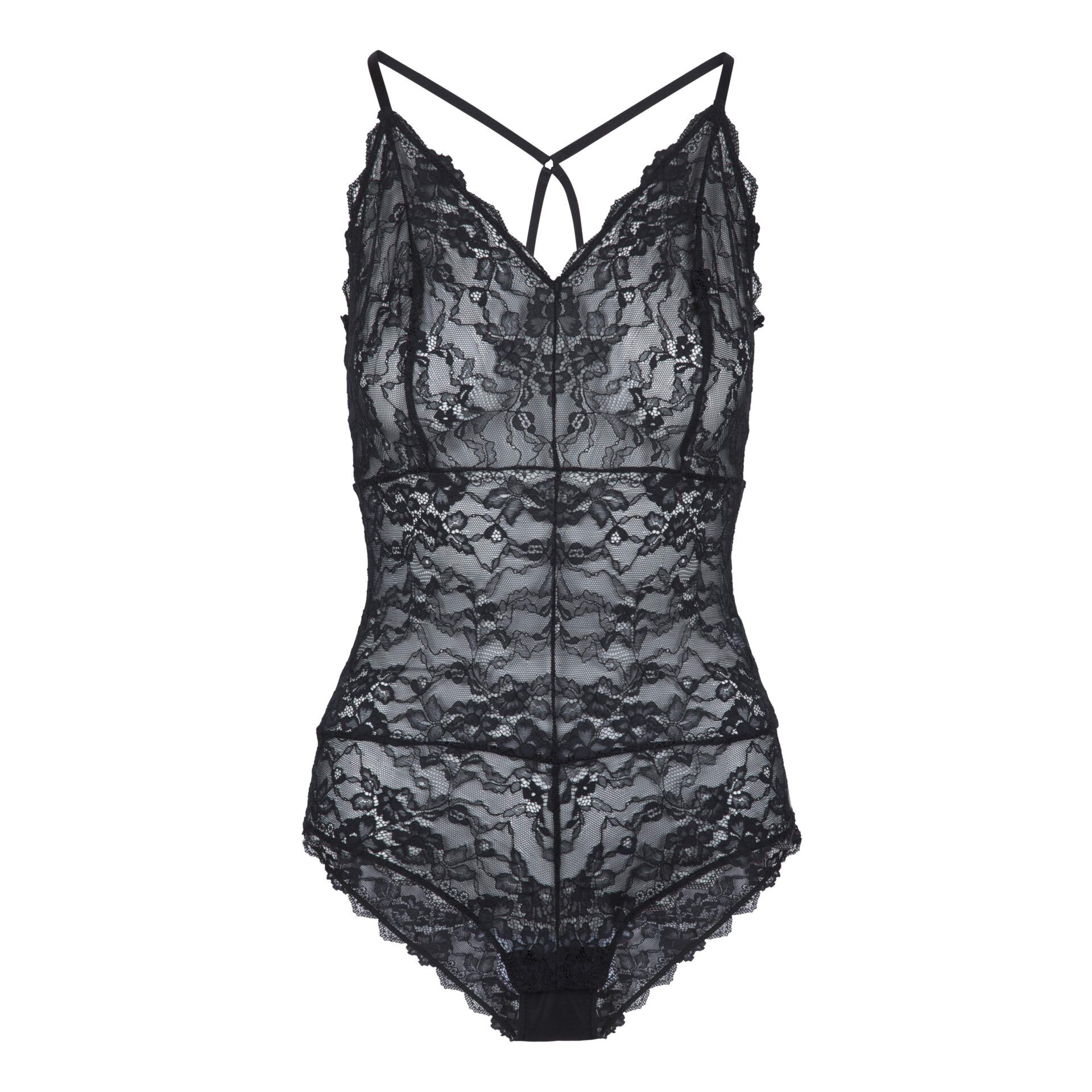 This gorgeous black lace and semi see-through bodysuit has an eye-catching design. This V-neck bodysuit features adjustable shoulder straps that are crossed on the back.