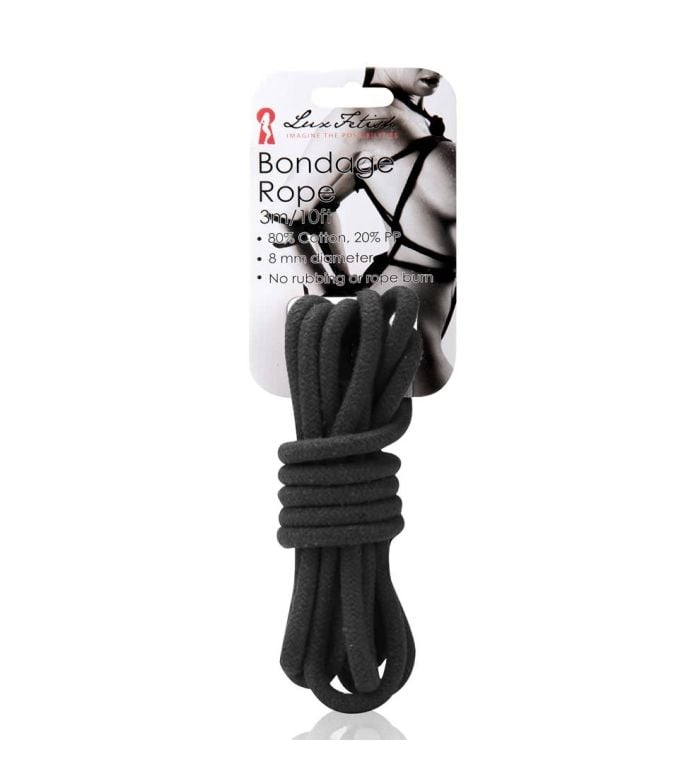 Once you feel the sensual sensation of this soft rope, you’ll fall in love! Experiment with different knots and learn the art of shibari kinbaku knots and positions. The soft finish of this durable rope adds a delicate touch to your kinkiest bedroom adventures or design yourself a sexy rope harness. Offering a generous length of 10 feet, the Lux Fetish Bondage Rope is made of soft cotton that won’t rub or burn your skin. Toss this rope in your suitcase; this versatile bondage accessory is a must-have for couples and fans of BDSM. - Comes in colorful display package with image of model for reference.