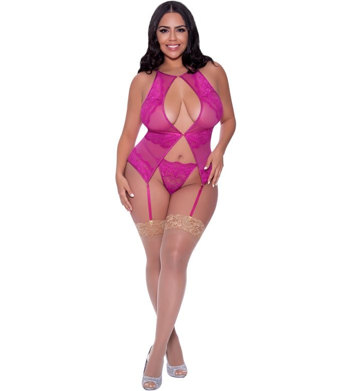 - Description: From the Exposed by Magic Silk collection, this style includes: a halter style basque featuring elastic adjustable shoulder straps with gold-tone sliders, silk lace-up ribbon in the back, gold-tone swan hook closure in the lower front, removable adjustable garters with gold-tone sliders, and a matching lace g-string.