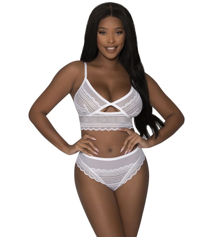 - Description: From the Exposed by Magic Silk collection, this style includes: a bralette featuring all-over lace, a keyhole design in front, adjustable shoulder straps with black sliders, strappy details in the back, and a matching cheeky panty with a keyhole design in the back.