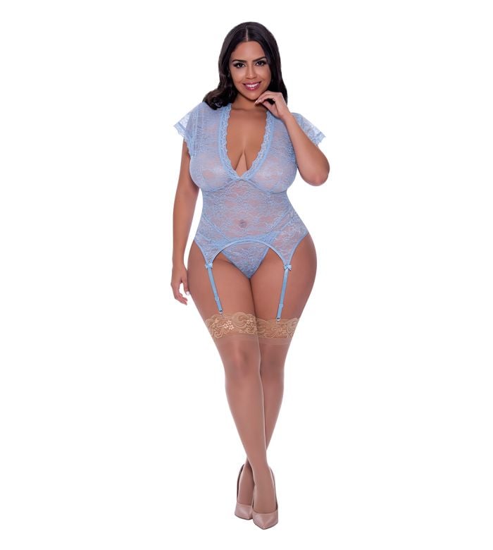 - Description: From the Exposed by Magic Silk collection, this style includes: a low-cut lace basque with satin periwinkle bows and attached adjustable garter straps with sliders, and a matching lace tanga.