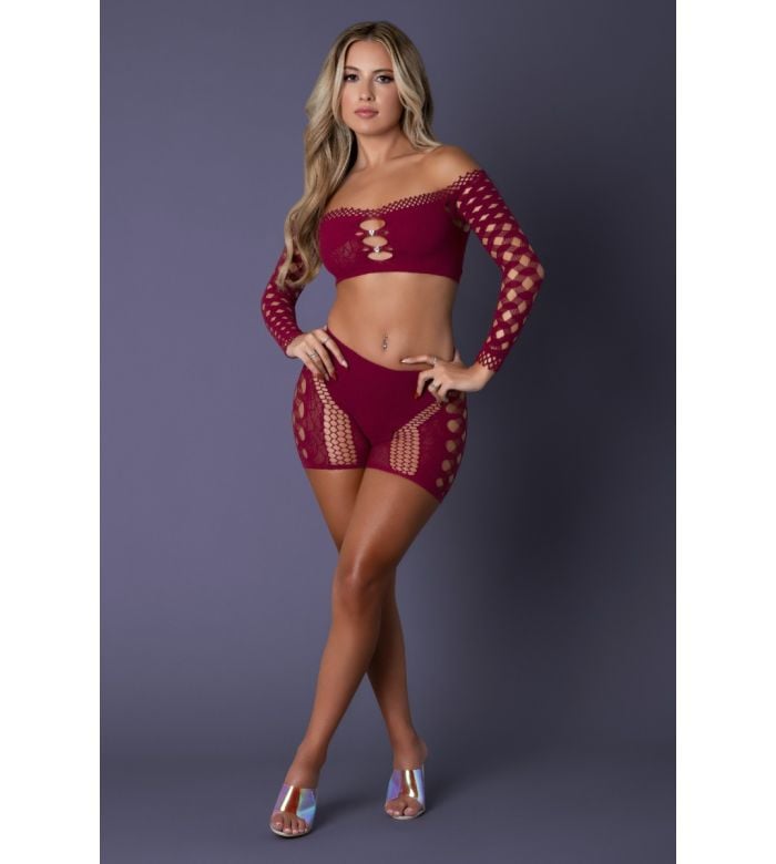 • Description: Elevate your inventory with the Seamless Crop Top & Short Set, a striking wholesale seamless lingerie piece from Exposed Lingerie by Magic Silk. This ultra-stretchy, breathable set features a crop top with diamond fishnet long sleeves, high-waist shorts, and alluring cutouts. Available in burgundy and deep purple, or black infused with clear rhinestones for a dazzling touch. A flattering, body-hugging style perfect for bold lingerie collections.
