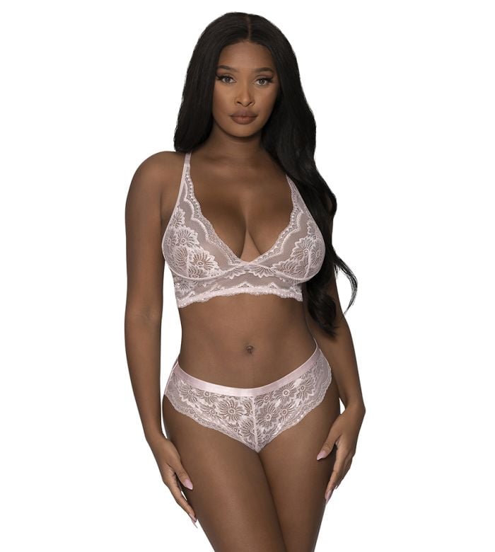 - Stretchy and breathable mesh is paired with soft lace details and silky ribbons in a wash of creamy blush or turquoise