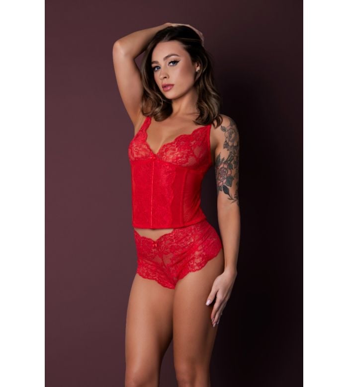 - Description: Heat up your selection with this wholesale red lace lingerie set from Magic Silk’s Sugar High collection. The lace plunge bustier with scalloped edges is paired with a matching boy short for a striking look. Crafted from vibrant red floral lace and sheer mesh, this set combines modern style with timeless appeal, making it perfect for customers looking to spice up their wardrobe.