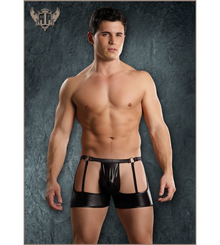 - Description: Garter short features comfort fit pouch, front and back attached garter straps, cire waistband with metal ring detail and cire trim.