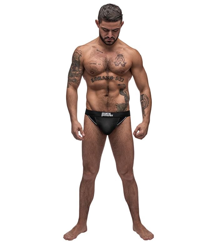- Description: From the Black Nite collection by Male Power, this style includes: A thong featuring sporty striped elastic inserts, a classic one-inch back, and an ultra sleek branded waistband.