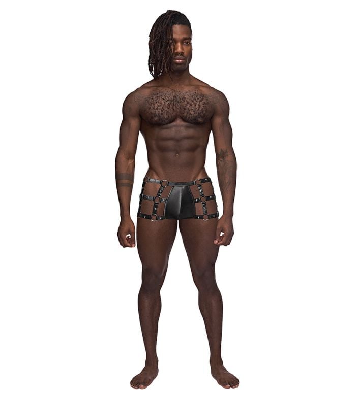 - Description: From the Fetish collection by Male Power, this style includes: A cutout cage short featuring studded fabric straps with metal rings.
