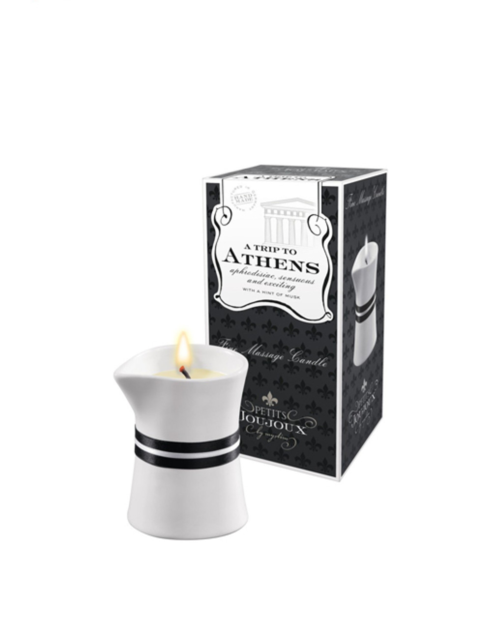 Light up the candle and wait a few minutes to allow a sufficient amount of the pleasant warm massage oil to melt. Blow out the candle and apply the oil on the parts of the skin that you wish to indulge with a sensuous massage. The luxurious Petits Joujoux massage candles are a journey for the senses available in six enchanting scents inspired by six lovely places from all over the world. A trip to Athens is a sweet and aromatic aphrodisiac of musk and patchouli. After the fragrant candle has been lit its wax melts into pleasantly warm massage oil enriched with high quality cosmetic ingredients like jojoba oil and Shea butter that provide the skin with nourishment and care. Petits Joujoux fine massage candles are made from all natural ingredients without any artificial coloring or preservatives. Thanks to their handy poring sprouts and the neat packaging these candles make a perfect gift.